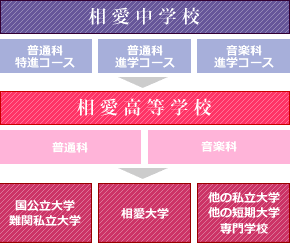 相愛学園は、高校・大学を併設している総合学園です。併設校特別推薦制度があり、希望すればほぼ全員が相愛高校への内部進学、併設校特別推薦制度を利用した相愛大学への進学が可能です。