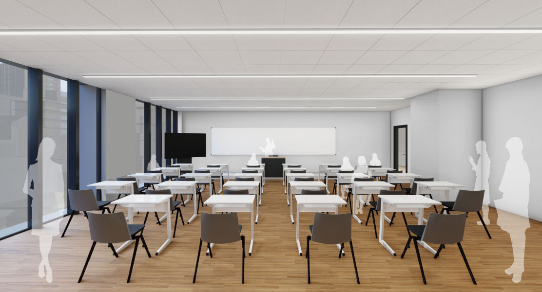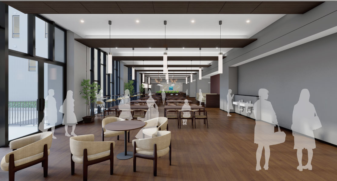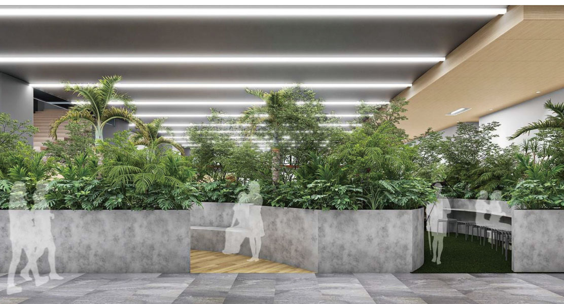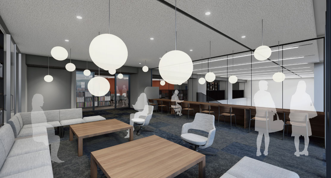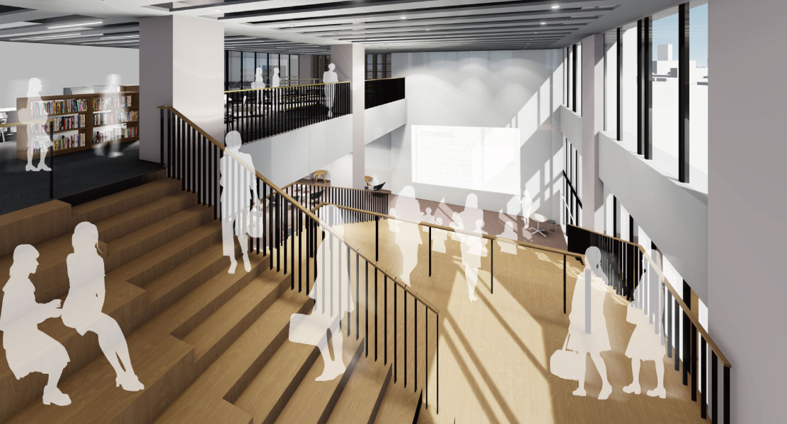 5階と6階をつなぐ大階段は座席にもなり、正面の壁を使ってプレゼンをしたり、クラシックのミニコンサートをしたりなど、利用方法は∞(無限大)です!