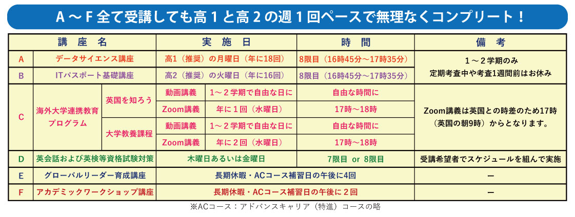 A〜F全てを受講したとしても、高1、高2の2年間で週1回ベースで無理なくコンプリートできます。
