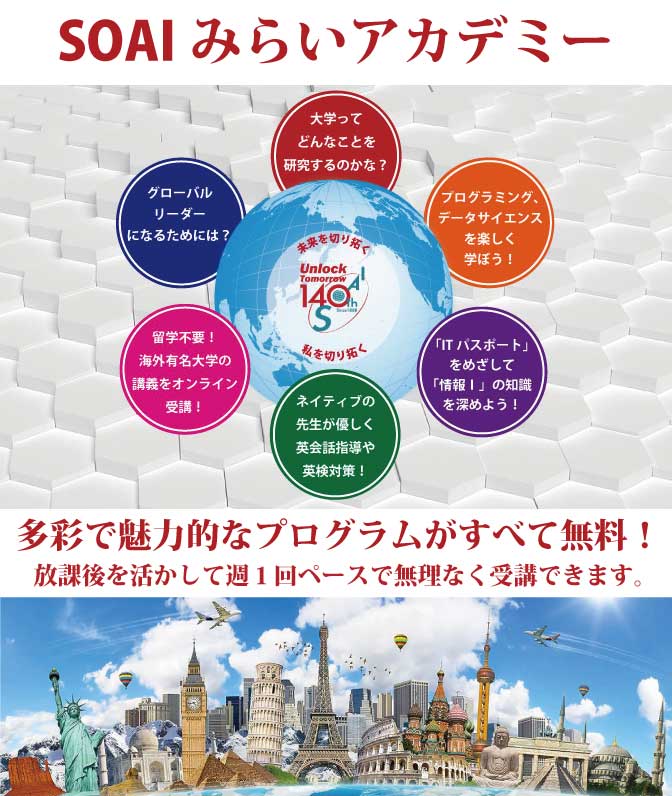 これからの大学や社会が求めるキャリアスキルを身につけるための新たな課外プログラム。それが「SOAIみらいアカデミー」です。定員枠が年々広がっている大学入試「総合型選抜」では、学力ではなく、何を研究したいか、これからの社会にどのように関わっていくのか、そのために高校までに何をしてきたかを具体的にアピールする必要があります。そのようなスキルを身につけることのできる「SOAIみらいアカデミー」で自分自身を切り拓いてみませんか?