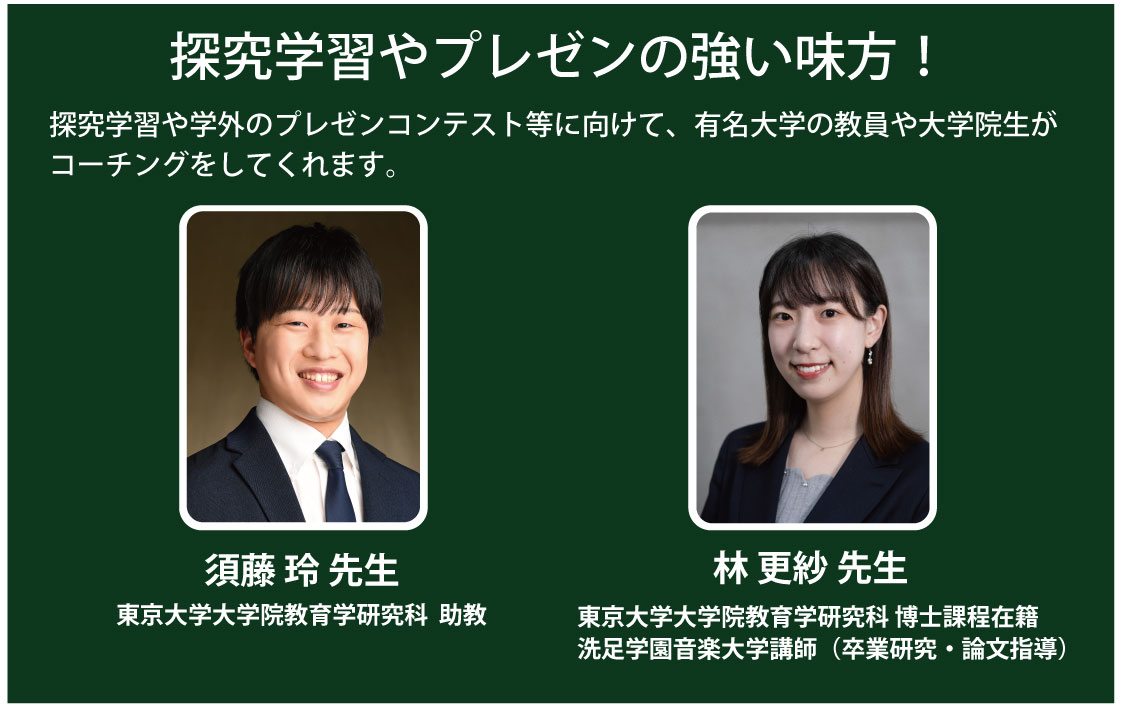 探究学習や外部のプレゼンコンテスト等に際して優しくコーチングをしてくれます。