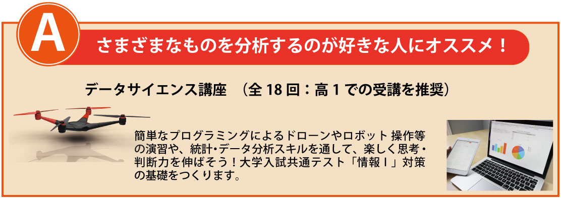 簡単なプログラミングによるドローンやロボット操作等の演習や、統計・データ分析スキルを通して、楽しく思考・判断力を伸ばそう!大学入試共通テスト「情報Ⅰ」対策の基礎をつくります。
