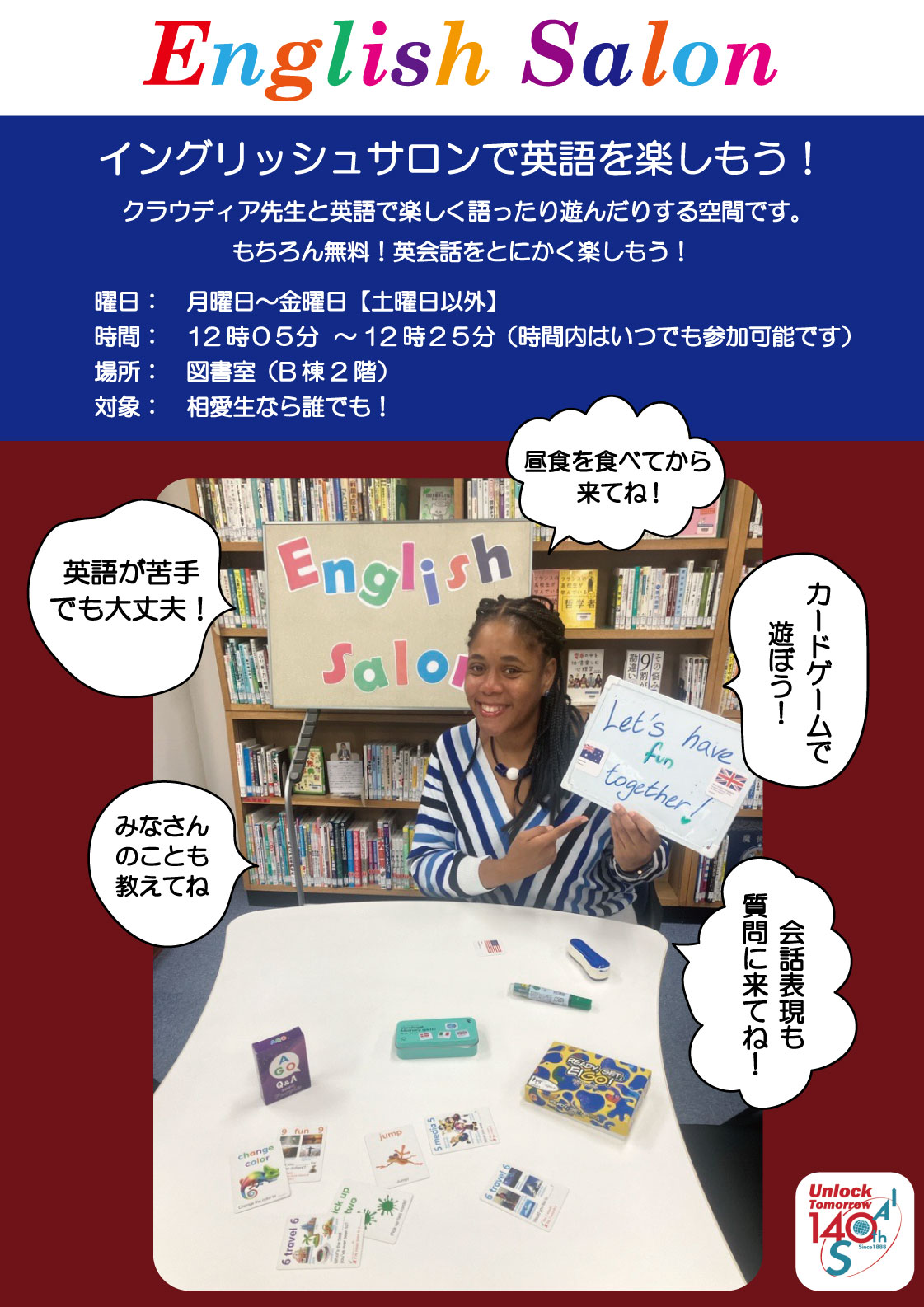 外国人教員がお昼休みに常駐し、カードゲームやクイズ大会など、日替わりのテーマで英会話をとにかく楽しむ空間です。もちろん無料!英語が苦手な人も気軽に参加しよう!