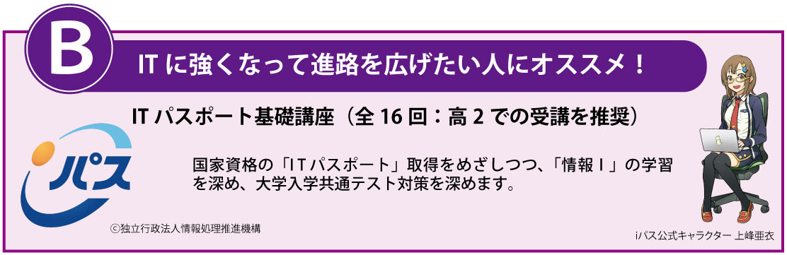 国家資格の「I T パスポート」取得をめざしつつ、「情報Ⅰ」の学習を深め、大学入学共通テスト対策を深めます。