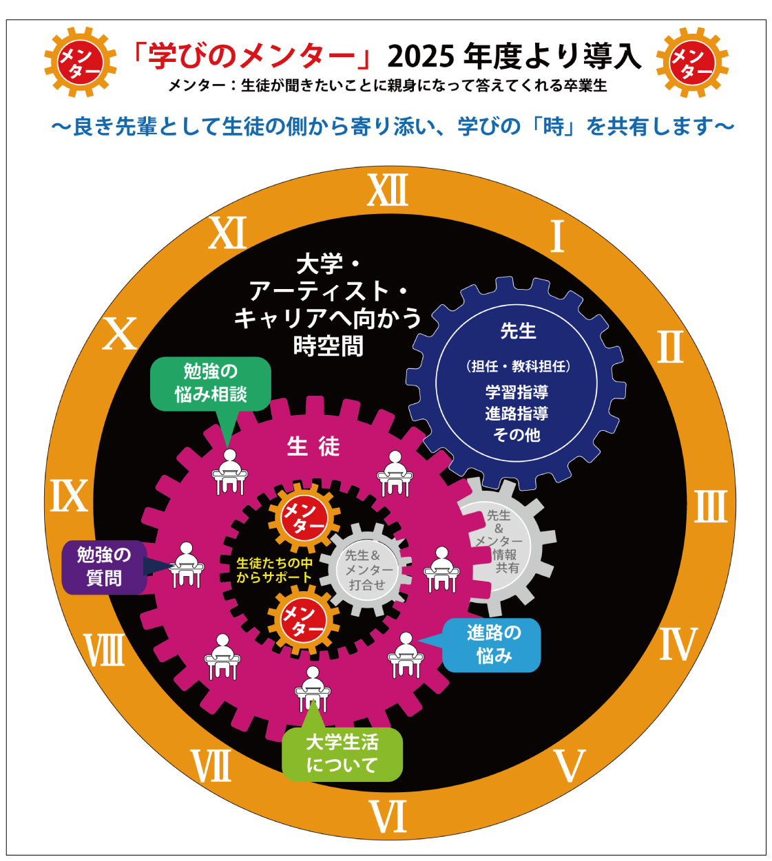 本校卒業生が放課後に良き先輩として生徒達に寄り添い、勉強を教えながら、学習に関するさまざまな相談にのってくれます。