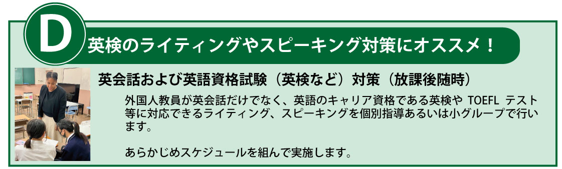 外国人教員が英会話だけでなく、英語のキャリア資格である英検等に対応できるライティング、スピーキングを個別指導あるいは小グループで行います。あらかじめスケジュールを組んで実施します。